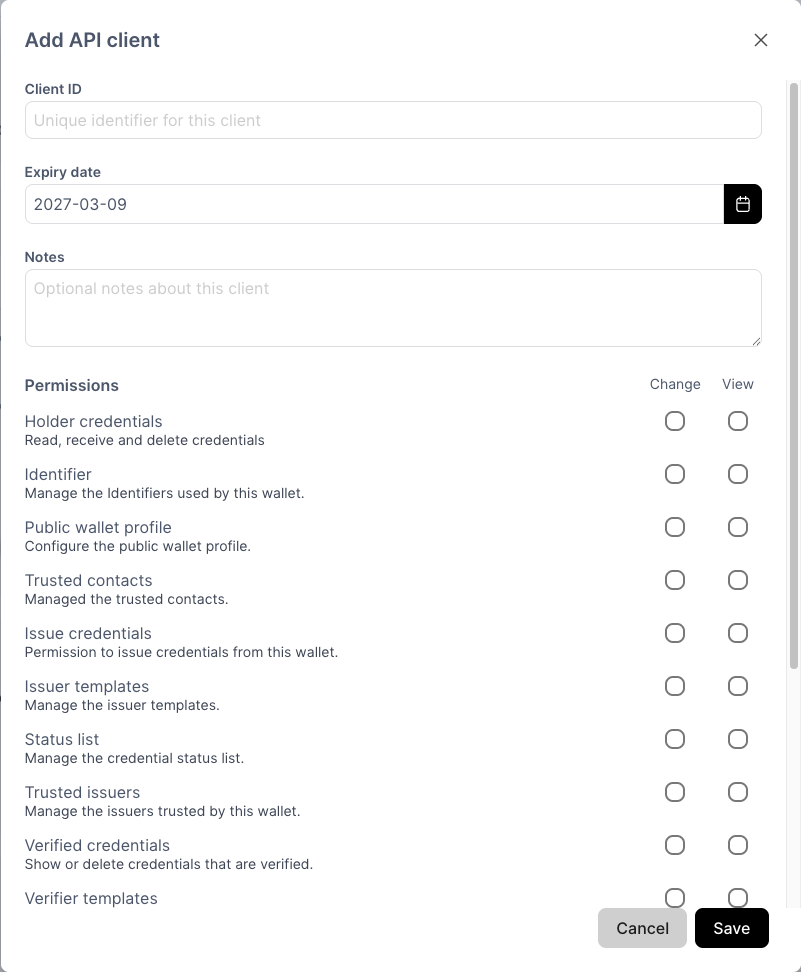 Each client ID has its own set of roles, an expiry date, and optional notes — so you can grant different integrating parties exactly the access they need, for as long as they need it.