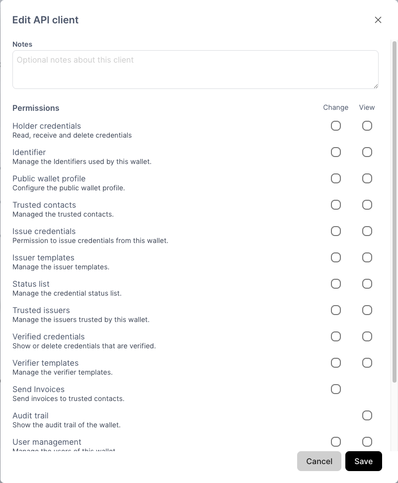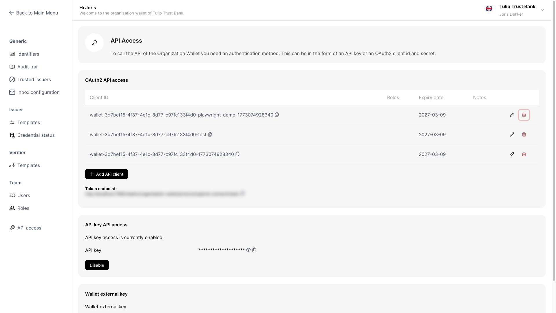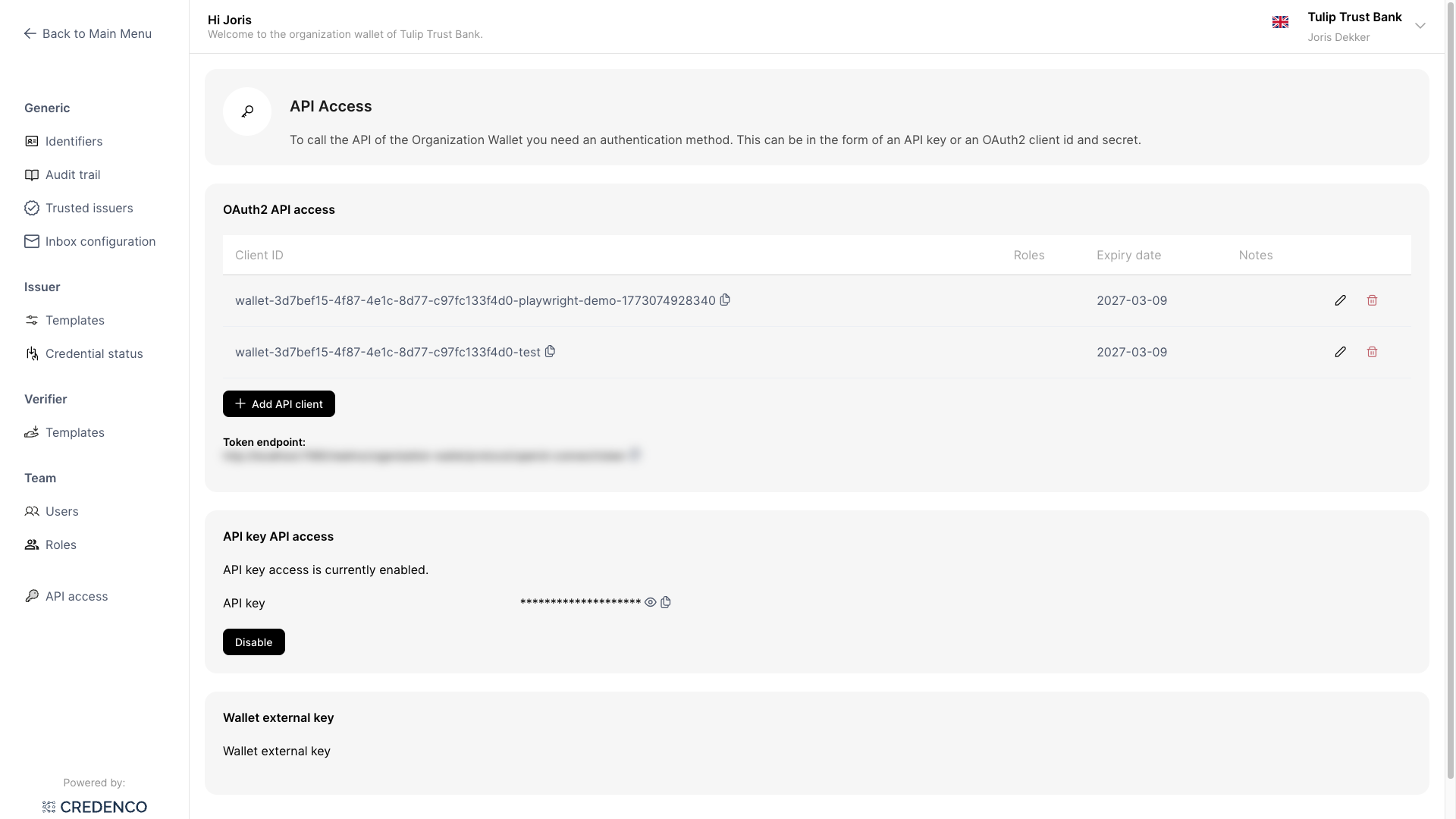 - Add a client ID to grant an external system access to your wallet