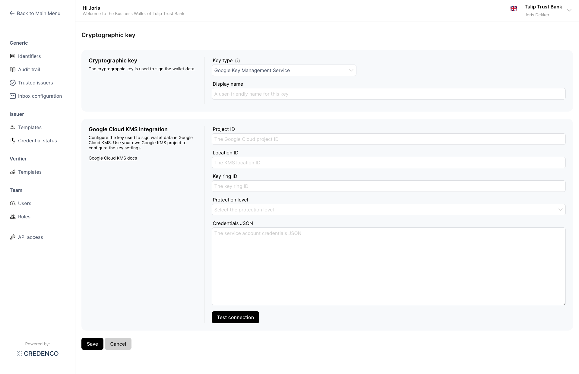 - Click Test connection to verify that the wallet can connect to Google Cloud KMS with the provided configuration.
