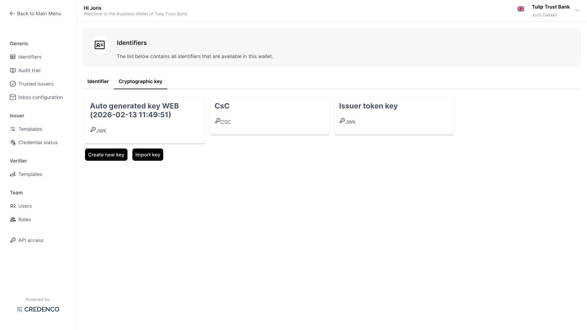 You need the Identifiers (Read) permission to view this screen, and Identifiers (Change) to create, edit, or delete cryptographic keys.