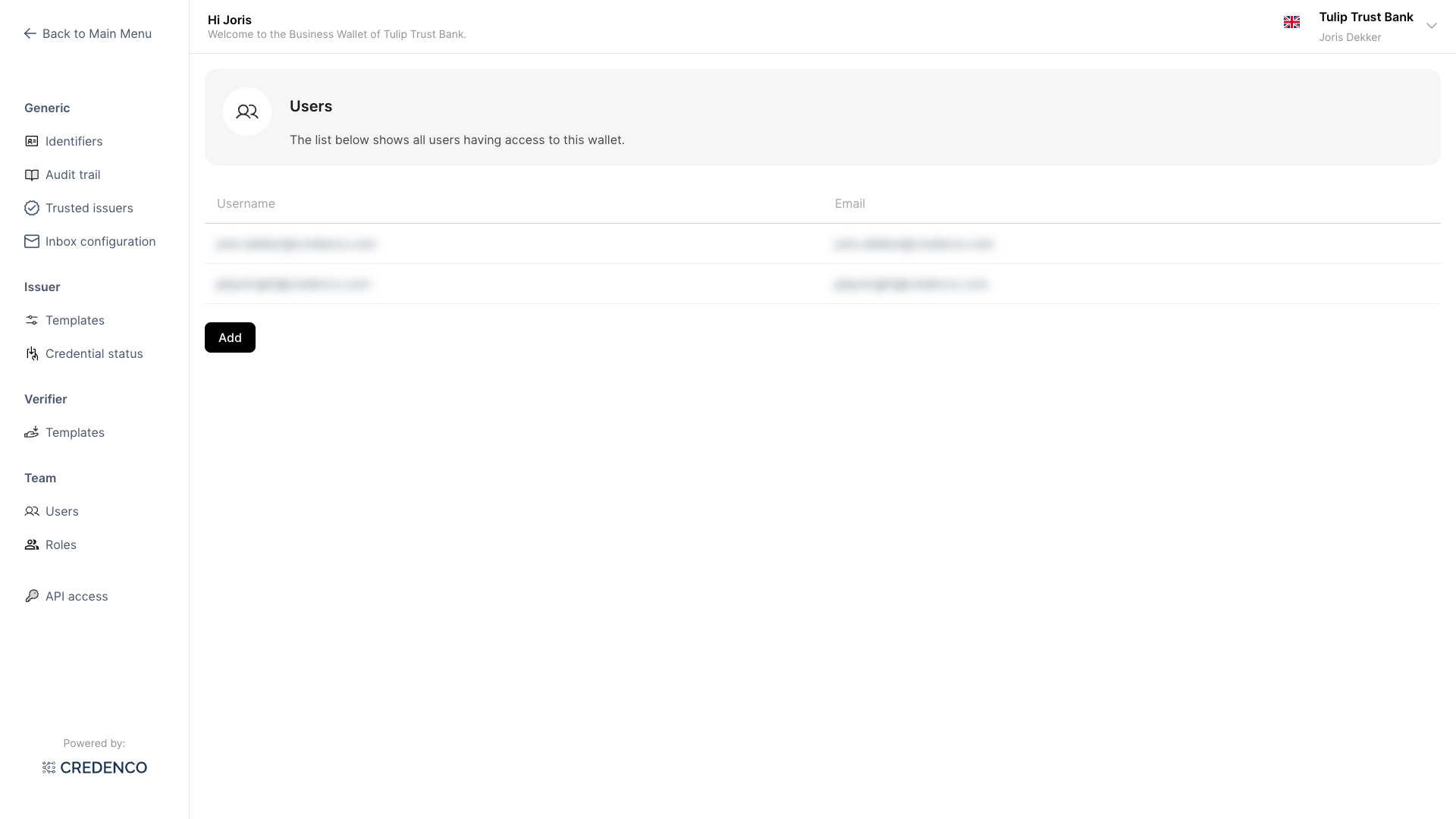 The Business Wallet includes user and role management features that allow you to control who has access to your wallet and what they can do. You can add and remove users, assign roles, and configure permissions to match your organization's needs.